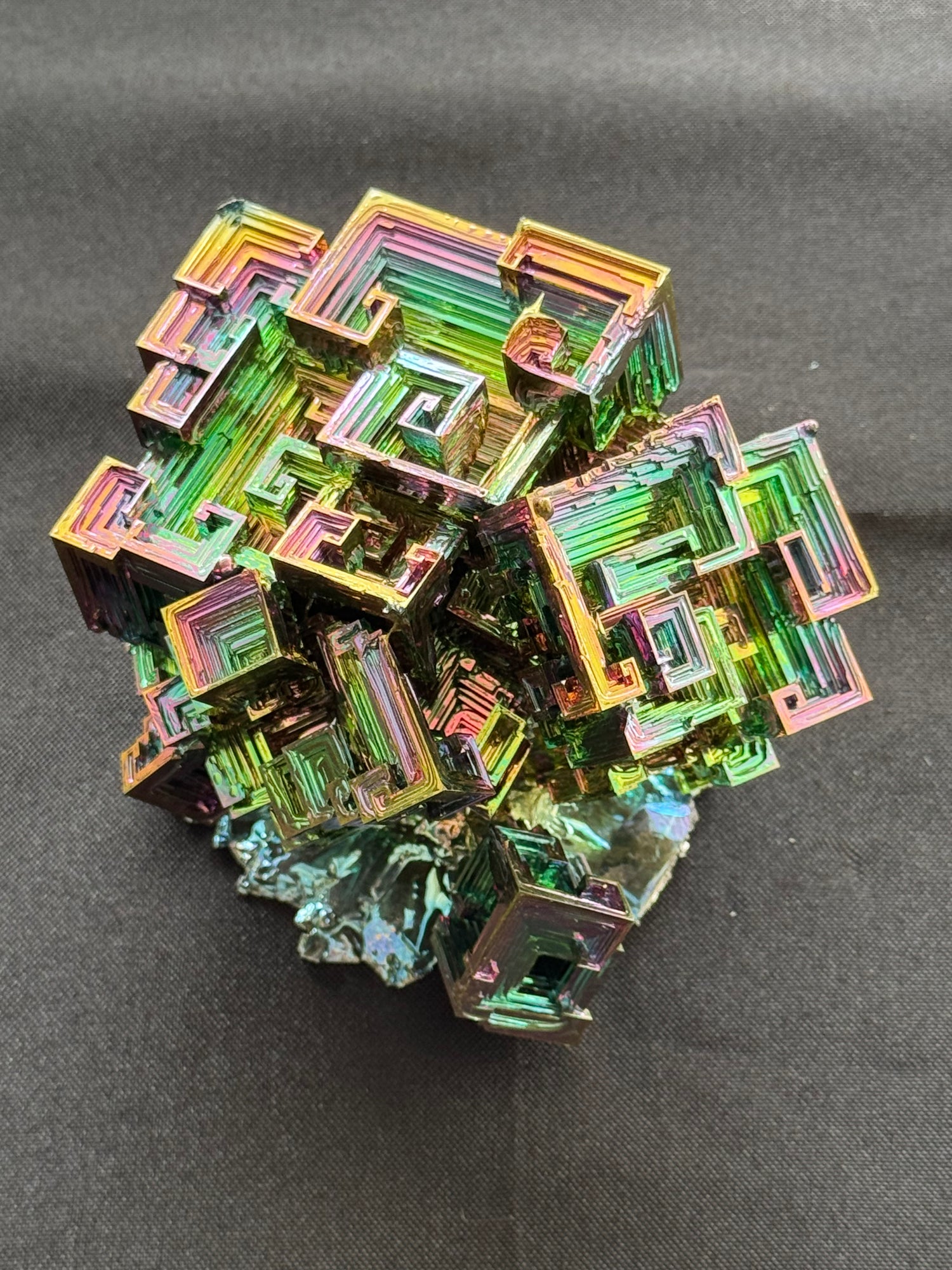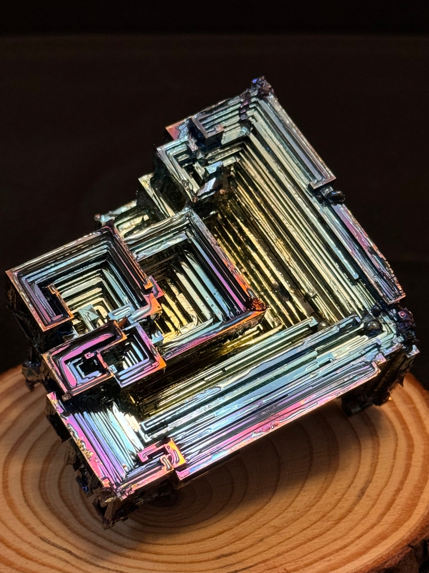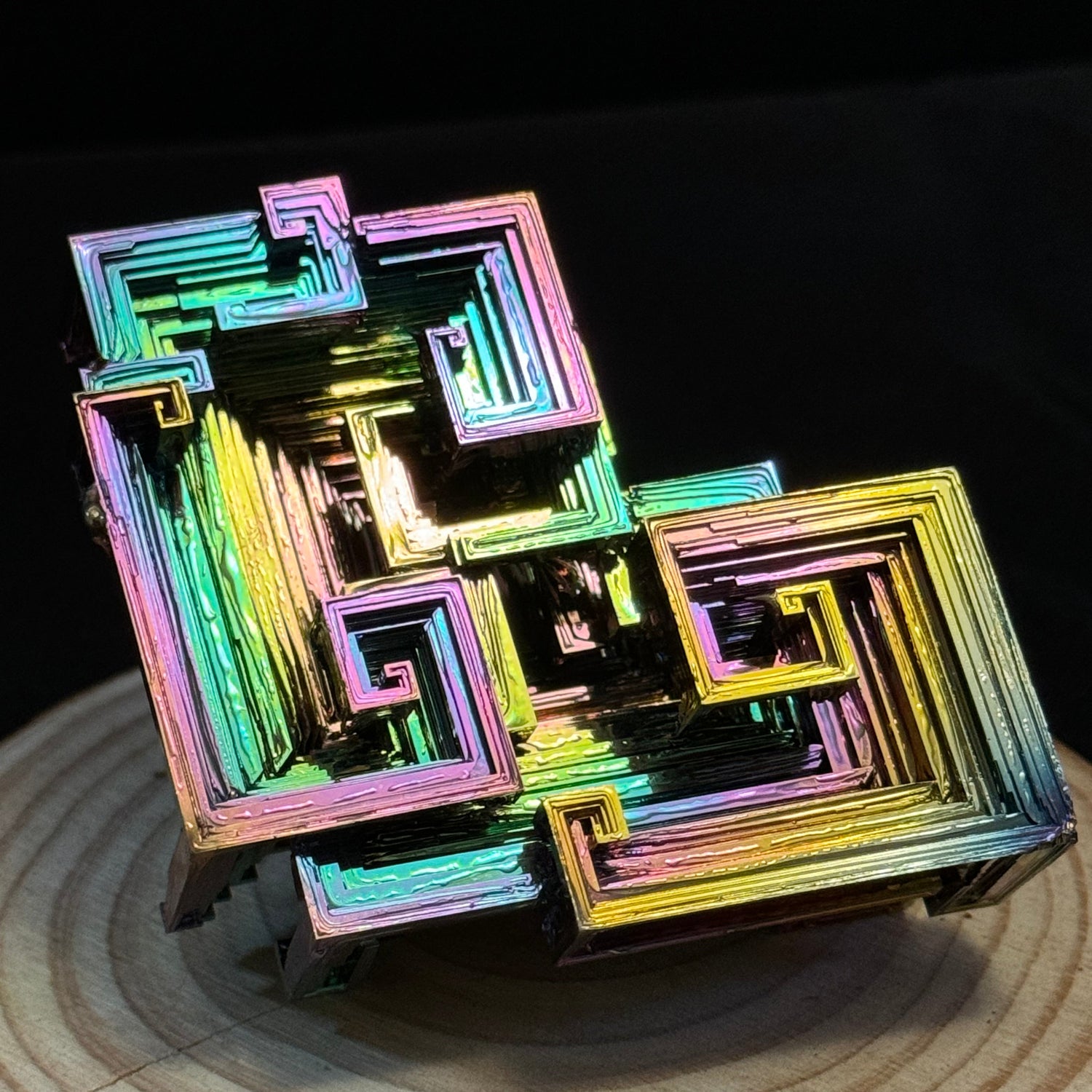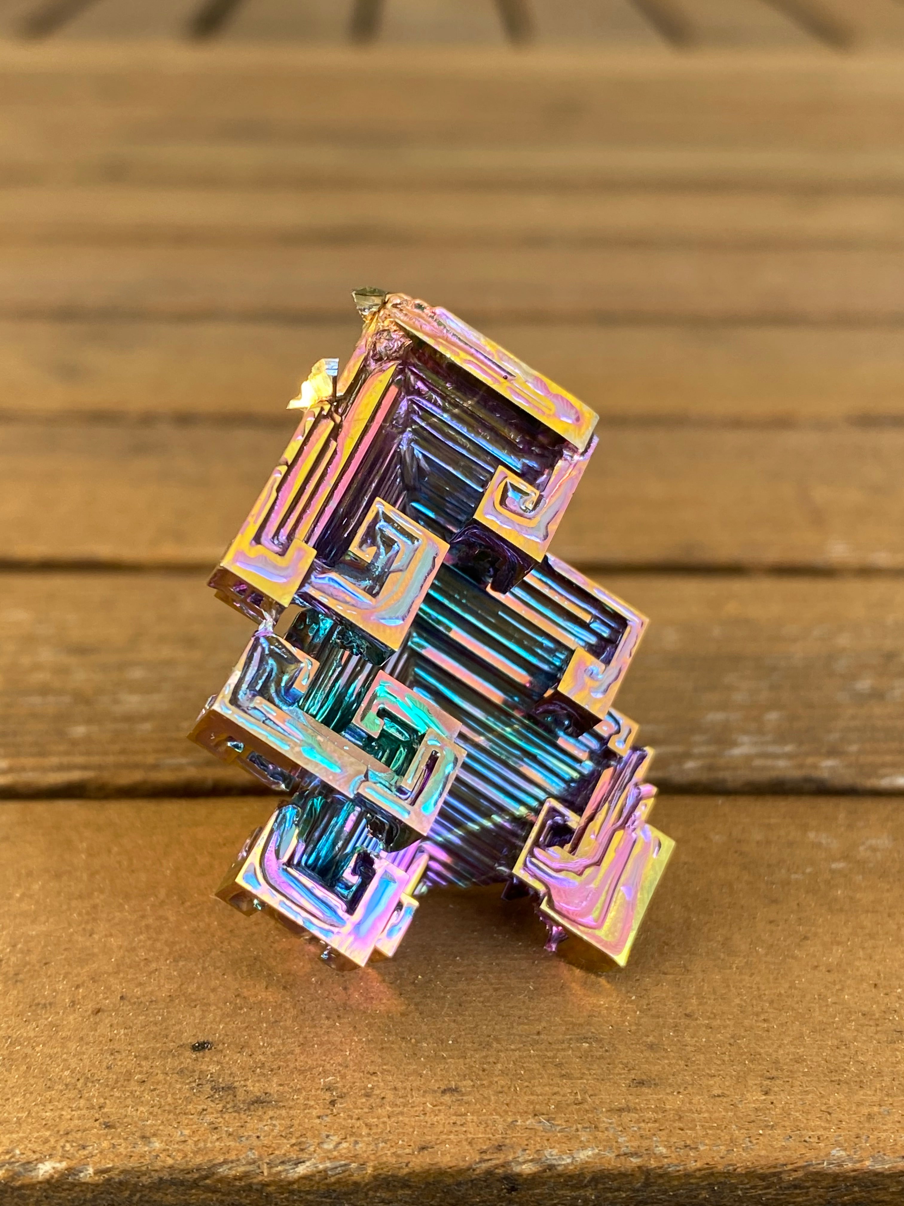 Discover the strange and stunning beauty of bismuth crystals. Grown from molten metal and shaped by nature’s own geometry, each crystal forms into stepped, angular patterns called hopper structures. Their iridescent colors shimmering blues, purples, golds, and greens come from a thin oxide layer that bends light like a prism.