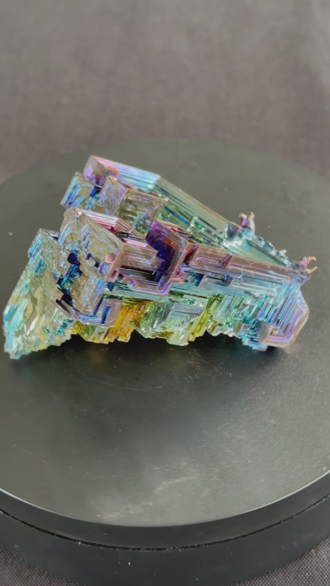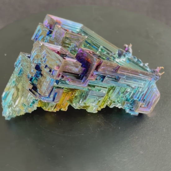 This bismuth crystal Is a rainbow full of color and with sharp edged steps and distinct corners. The iridescent colours shine and reflect from every angle. This crystal is one solid piece, nothing has been colored or attached separately. Bismuth is an element on the periodic table next to lead, with the symbol Bi and an atomic number of 83. Bismuth rarely occurs in the earth naturally, and when it does only extremely small crystals are formed. Due to that reason, these crystals are grown in a facility in Vancouver. There are as many as twenty colors or shades that you will find in the crystal. The possible colors include blue, purple, yellow, green, red, silver and gold. bismuth crystals are known to be healing crystals. They stimulate energy, support transformation, and help relieve symptoms of isolation and loneliness. This crystal is truly unique, in its colors and shape, and the energy that surrounds it.