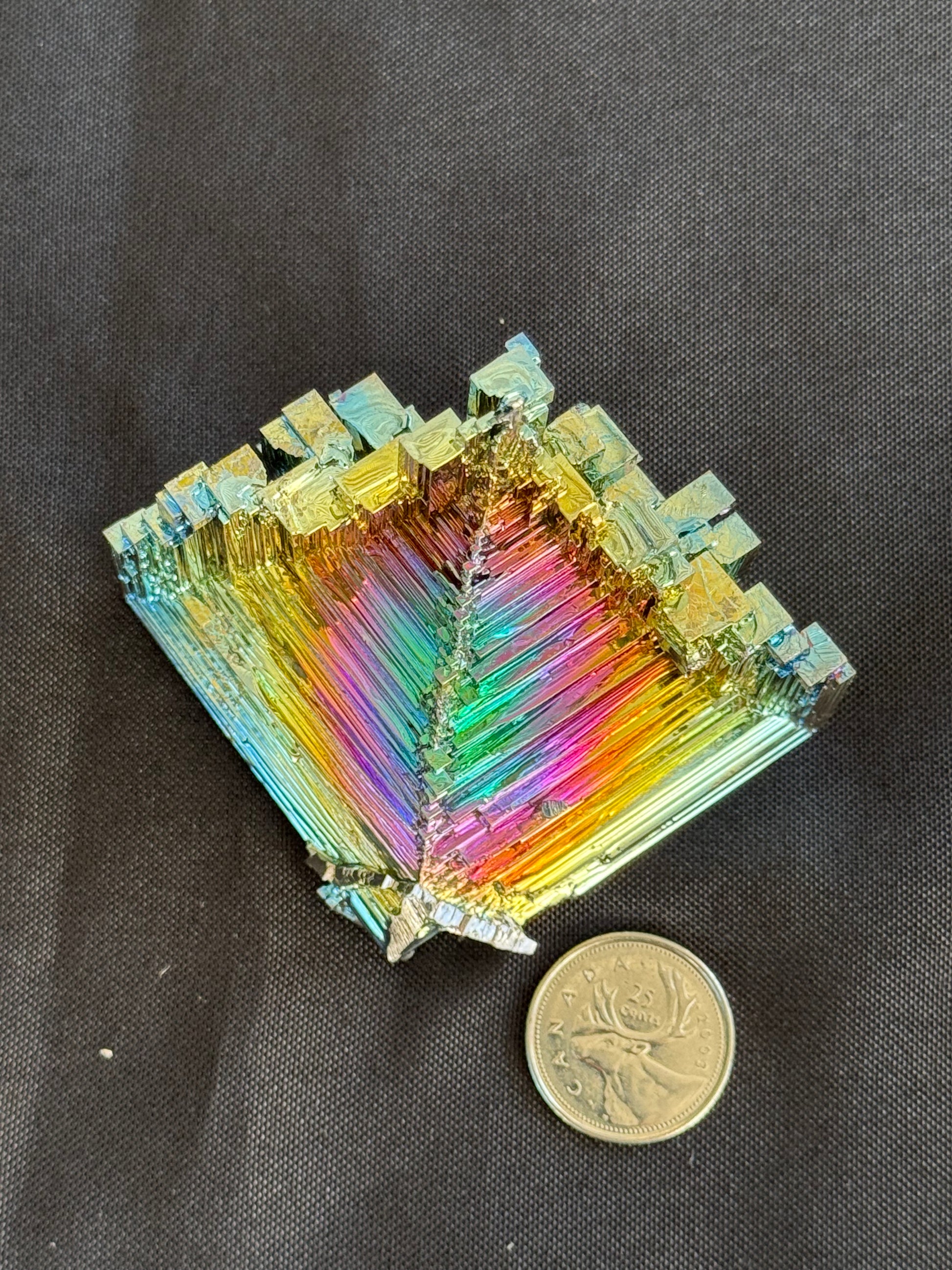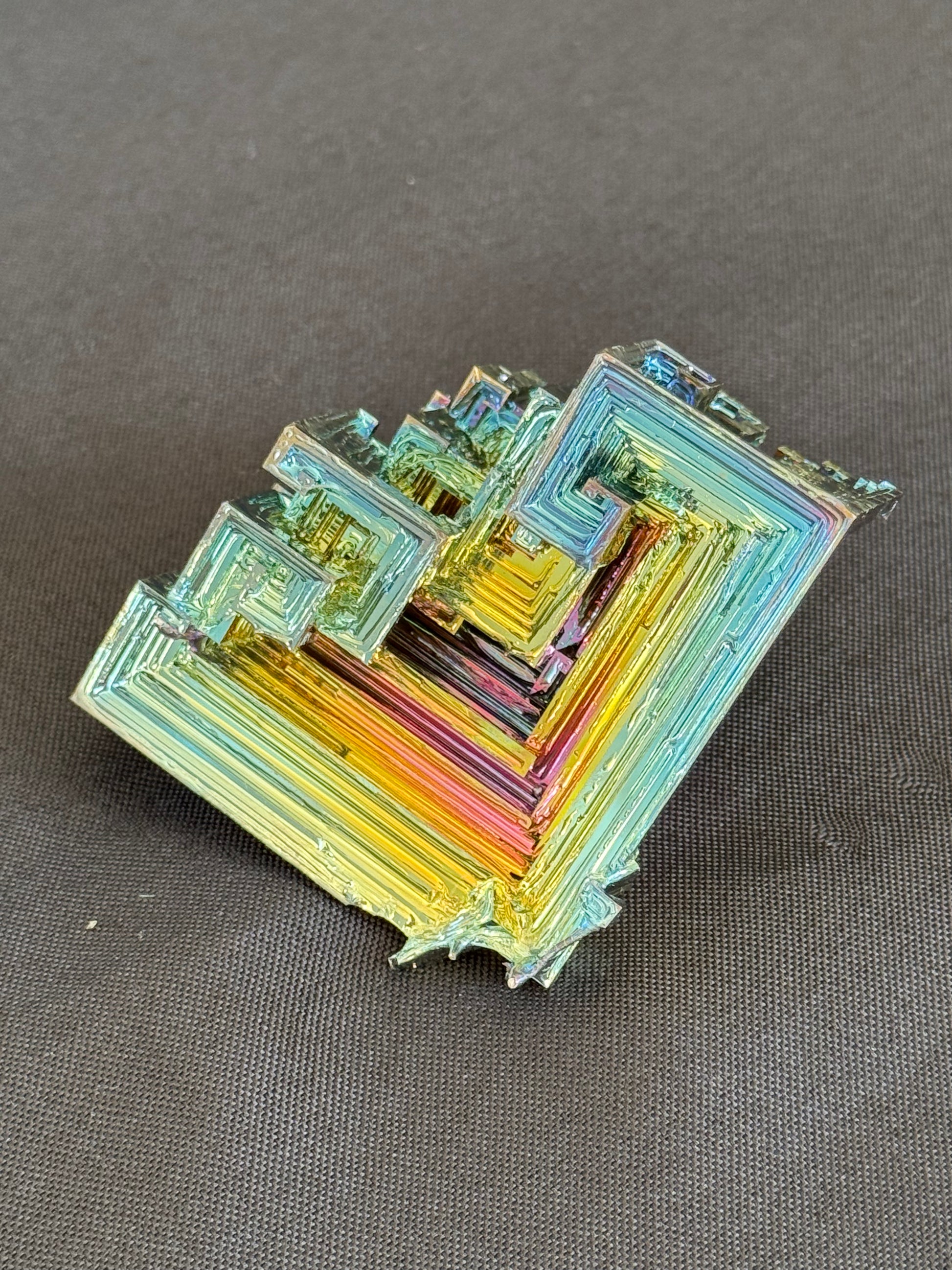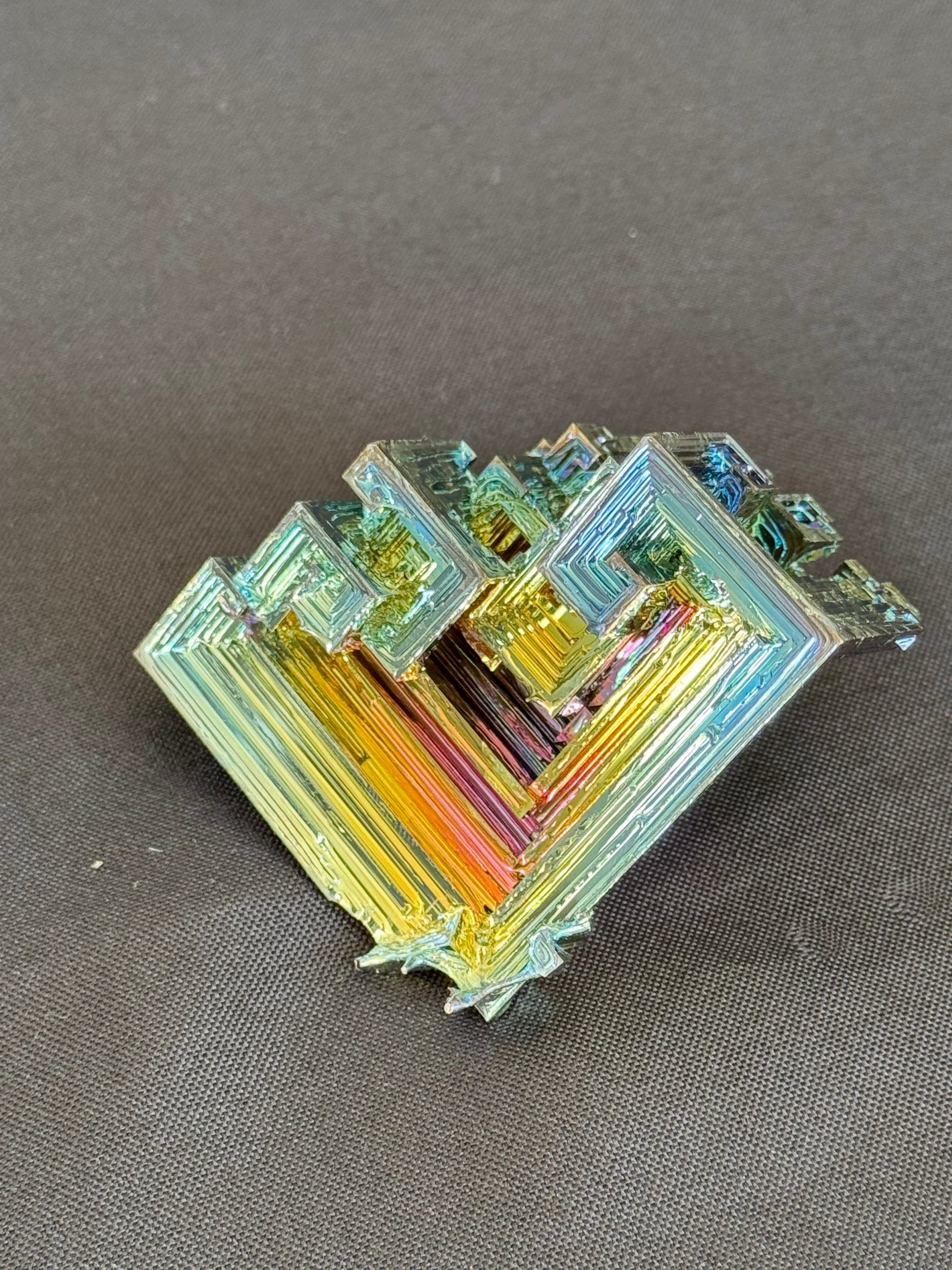 This bismuth crystal weighs 285g. This bismuth crystal Is a rainbow full of color and with sharp edged steps and distinct corners. The iridescent colours shine and reflect from every angle. This crystal is one solid piece, nothing has been colored or attached separately. Bismuth is an element on the periodic table next to lead, with the symbol Bi and an atomic number of 83. Bismuth rarely occurs in the earth naturally, and when it does only extremely small crystals are formed. Due to that reason, these crystals are grown in a facility in Vancouver. There are as many as twenty colors or shades that you will find in the crystal. The possible colors include blue, purple, yellow, green, red, silver and gold. bismuth crystals are known to be healing crystals. They stimulate energy, support transformation, and help relieve symptoms of isolation and loneliness. This crystal is truly unique, in its colors and shape, and the energy that surrounds it.