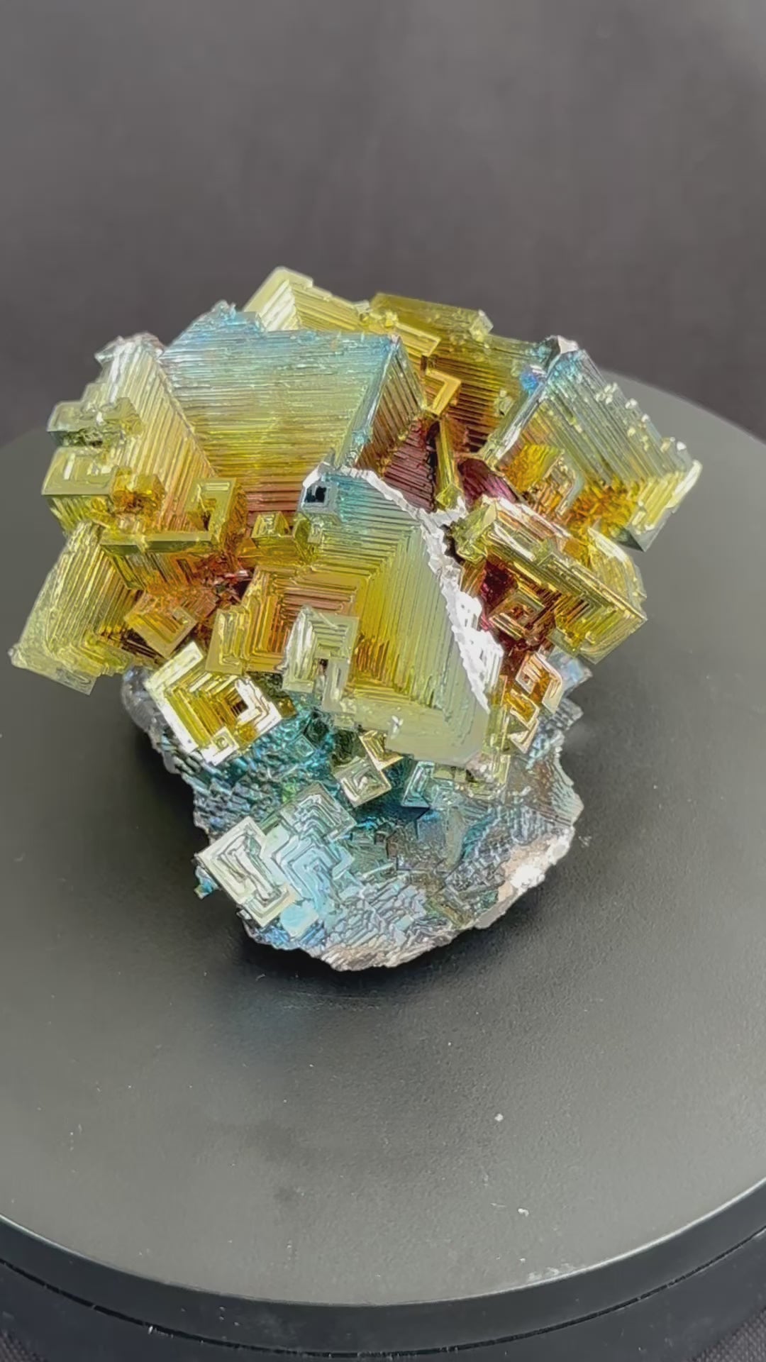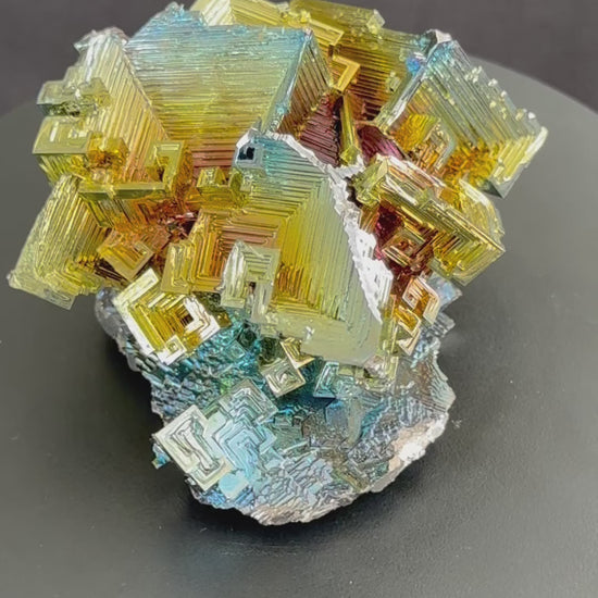 This bismuth crystal Is a rainbow full of color and with sharp edged steps and distinct corners. The iridescent colours shine and reflect from every angle. This crystal is one solid piece, nothing has been colored or attached separately. Bismuth is an element on the periodic table next to lead, with the symbol Bi and an atomic number of 83. Bismuth rarely occurs in the earth naturally, and when it does only extremely small crystals are formed. Due to that reason, these crystals are grown in a facility in Vancouver. There are as many as twenty colors or shades that you will find in the crystal. The possible colors include blue, purple, yellow, green, red, silver and gold. bismuth crystals are known to be healing crystals. They stimulate energy, support transformation, and help relieve symptoms of isolation and loneliness. This crystal is truly unique, in its colors and shape, and the energy that surrounds it.