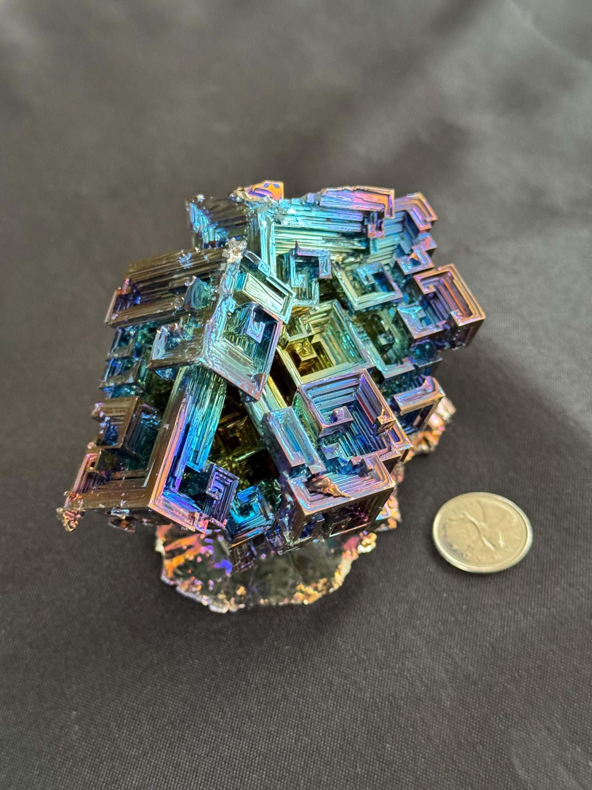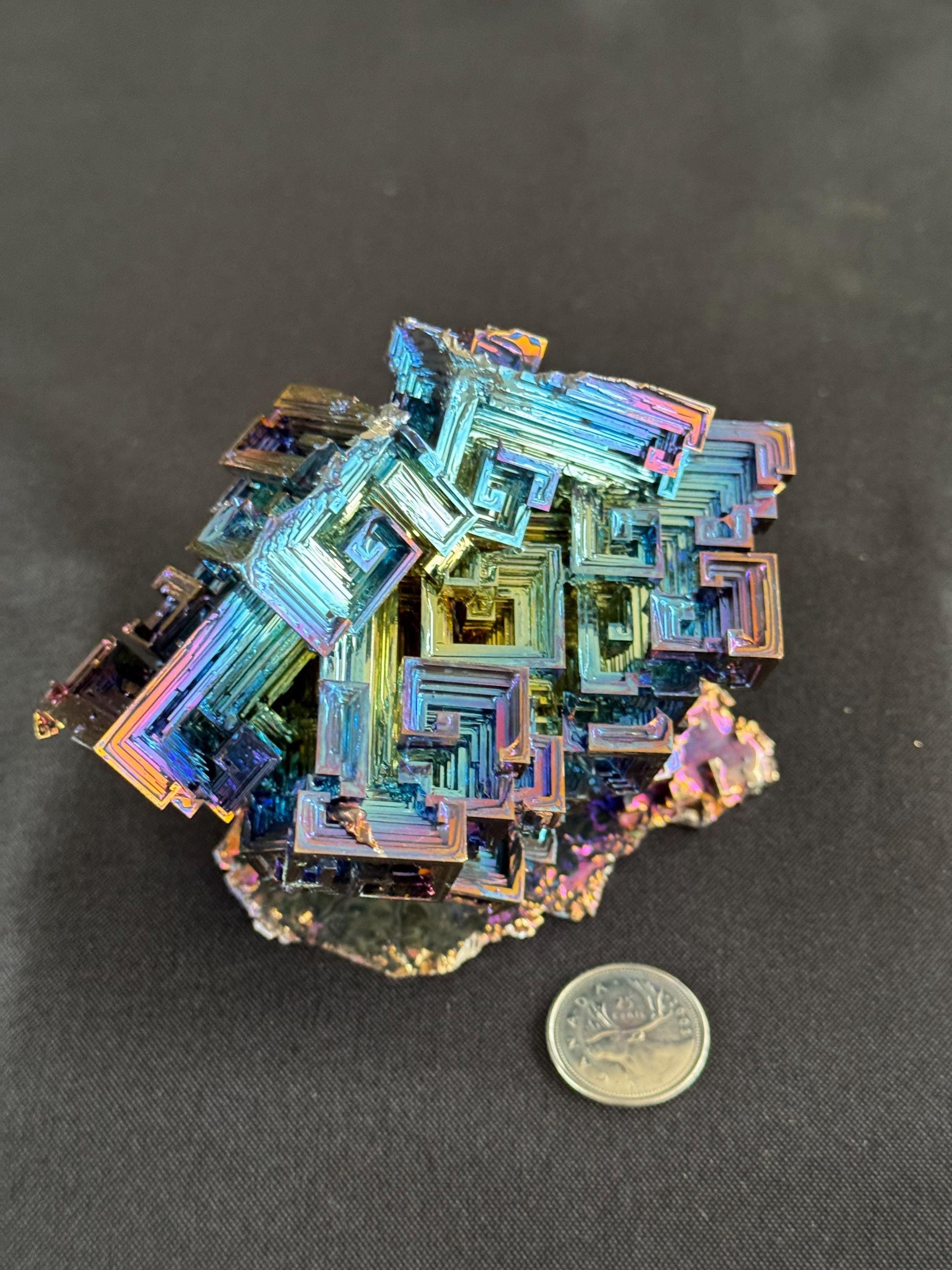 This bismuth crystal Is a rainbow full of color and with sharp edged steps and distinct corners. The iridescent colours shine and reflect from every angle. This crystal is one solid piece, nothing has been colored or attached separately. Bismuth is an element on the periodic table next to lead, with the symbol Bi and an atomic number of 83. Bismuth rarely occurs in the earth naturally, and when it does only extremely small crystals are formed. Due to that reason, these crystals are grown in a facility in Vancouver. There are as many as twenty colors or shades that you will find in the crystal. The possible colors include blue, purple, yellow, green, red, silver and gold. bismuth crystals are known to be healing crystals. They stimulate energy, support transformation, and help relieve symptoms of isolation and loneliness. This crystal is truly unique, in its colors and shape, and the energy that surrounds it.