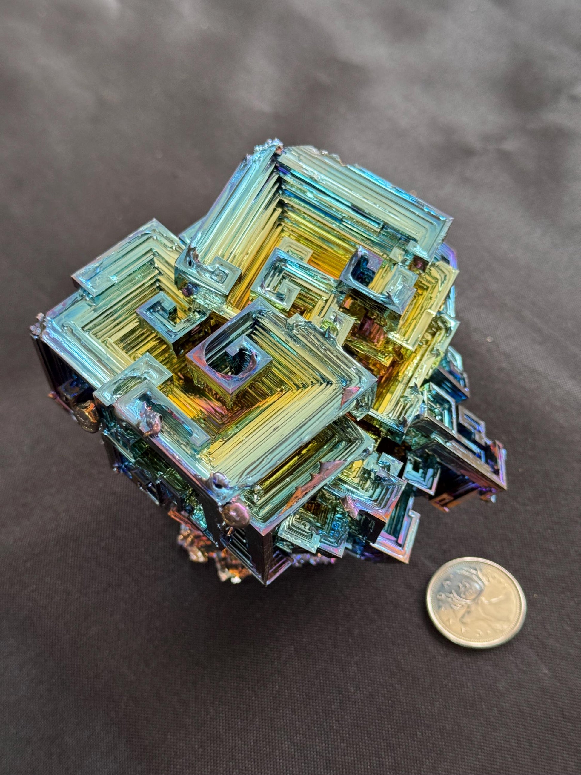 This bismuth crystal Is a rainbow full of color and with sharp edged steps and distinct corners. The iridescent colours shine and reflect from every angle. This crystal is one solid piece, nothing has been colored or attached separately. Bismuth is an element on the periodic table next to lead, with the symbol Bi and an atomic number of 83. Bismuth rarely occurs in the earth naturally, and when it does only extremely small crystals are formed. Due to that reason, these crystals are grown in a facility in Vancouver. There are as many as twenty colors or shades that you will find in the crystal. The possible colors include blue, purple, yellow, green, red, silver and gold. bismuth crystals are known to be healing crystals. They stimulate energy, support transformation, and help relieve symptoms of isolation and loneliness. This crystal is truly unique, in its colors and shape, and the energy that surrounds it.