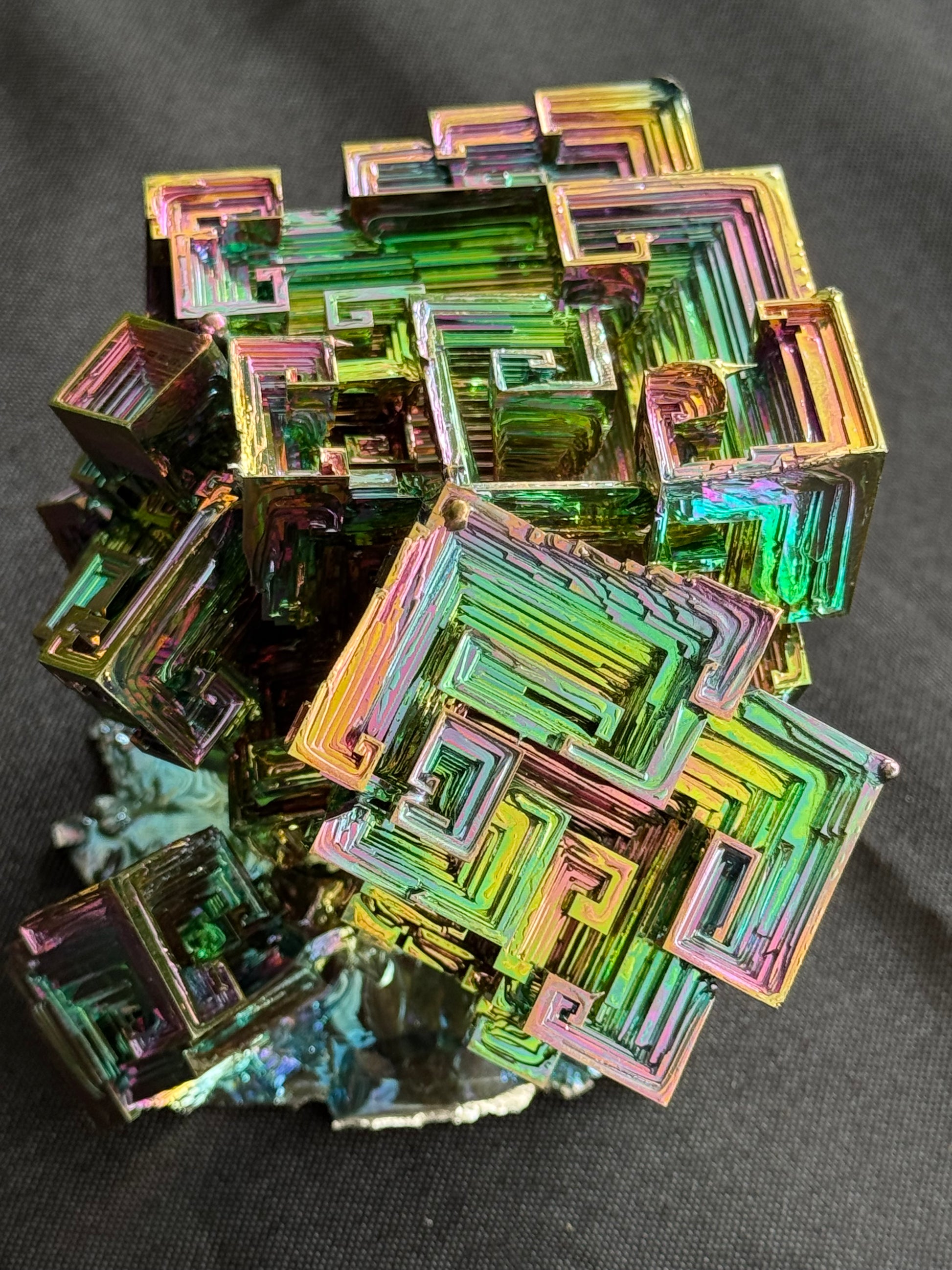 This bismuth crystal Is a rainbow full of color and with sharp edged steps and distinct corners. The iridescent colours shine and reflect from every angle. This crystal is one solid piece, nothing has been colored or attached separately. Bismuth is an element on the periodic table next to lead, with the symbol Bi and an atomic number of 83. Bismuth rarely occurs in the earth naturally, and when it does only extremely small crystals are formed. Due to that reason, these crystals are grown in a facility in Vancouver. There are as many as twenty colors or shades that you will find in the crystal. The possible colors include blue, purple, yellow, green, red, silver and gold. bismuth crystals are known to be healing crystals. They stimulate energy, support transformation, and help relieve symptoms of isolation and loneliness. This crystal is truly unique, in its colors and shape, and the energy that surrounds it.