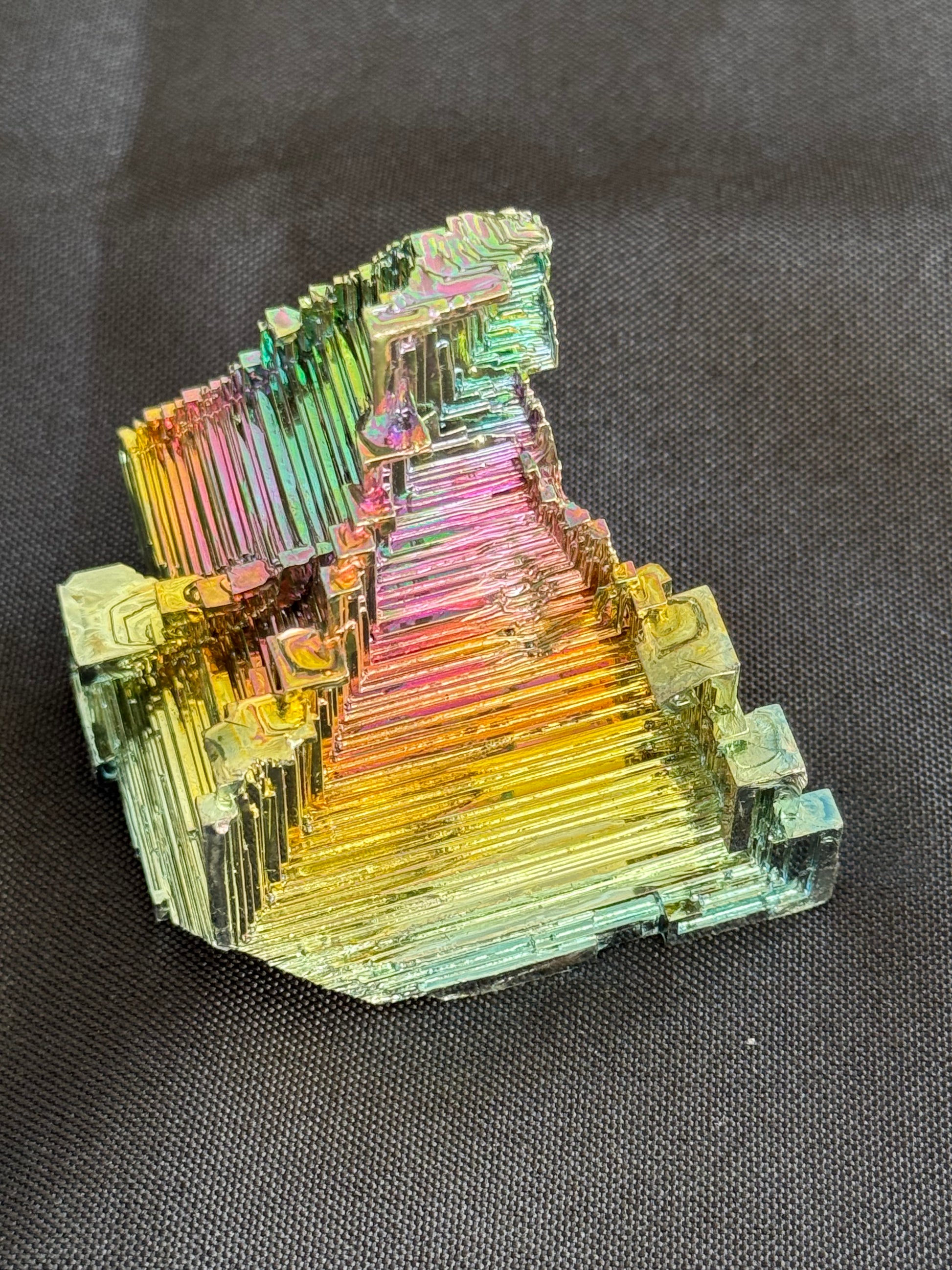 This bismuth crystal Is a rainbow full of color and with sharp edged steps and distinct corners. The iridescent colours shine and reflect from every angle. This crystal is one solid piece, nothing has been colored or attached separately. Bismuth is an element on the periodic table next to lead, with the symbol Bi and an atomic number of 83. Bismuth rarely occurs in the earth naturally, and when it does only extremely small crystals are formed. Due to that reason, these crystals are grown in a facility in Vancouver. There are as many as twenty colors or shades that you will find in the crystal. The possible colors include blue, purple, yellow, green, red, silver and gold. bismuth crystals are known to be healing crystals. They stimulate energy, support transformation, and help relieve symptoms of isolation and loneliness. This crystal is truly unique, in its colors and shape, and the energy that surrounds it.